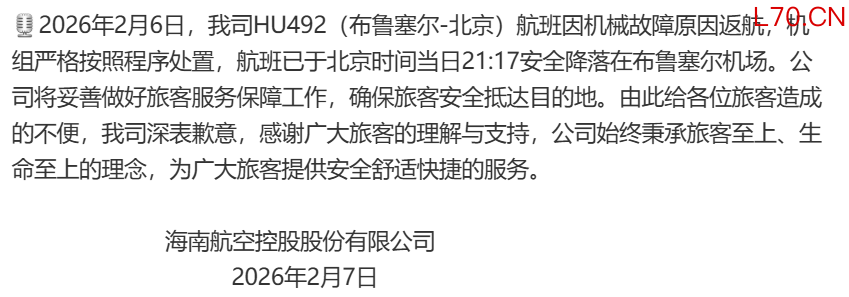 海航就HU492航班因机械故障原因返航致歉