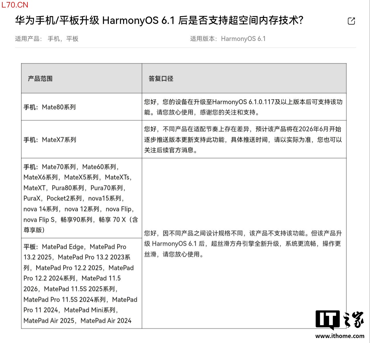 华为超空间内存技术适配计划公布:Mate X7 系列预计 6 月推送