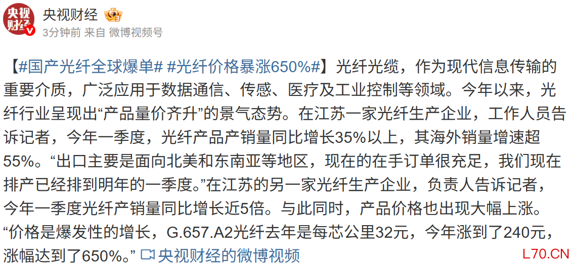 国产光纤全球爆单 部分产品价格暴涨650%