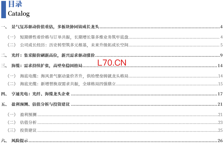 短期景气复苏释放业绩弹性,多主业共振驱动长期成长:展望未来,短期看,2026年业绩弹性主要来自光纤供需紧张带来的价格上行与海洋业务订单加速兑现的共振。公司在手订单充裕,能源领域超200亿元、海洋通信超70亿元、PEACE跨洋海缆项目超3亿美元,为未来1-3年利润增长提供了较强可见度。中期看,业绩核心驱动将向“高价值光纤放量+深远海海缆升级+海洋通信扩张”切换。与历史上依赖单一光纤周期不同,本轮盈利改善基础更为扎实:一方面,光纤需求已从传统运营商集采拓展至无人机、AI数据中心互联、DCI、算力枢纽、空芯/多芯等高附加值场景,供需结构显著改善;另一方面,受益于“十五五”期间深海科技政策优先级提升,海风高压化升级、国际海缆更新换代等需求持续催化,为海洋工程与海洋通信业务带来中期确定性。