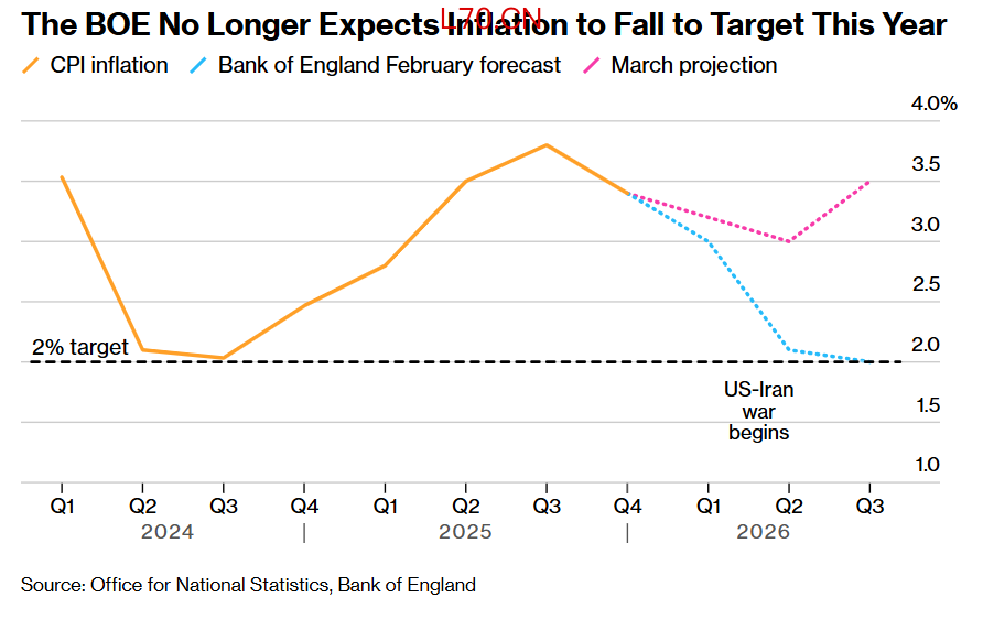 2月的全球经济数据已被2月底开启的新一轮中东地缘政治冲突所掩盖,这场冲突彻底颠覆了全球通胀前景,并促使交易员们押注英国央行即将转向加息周期,以阻止价格上涨趋势形成反馈循环。 Bloomberg Economics测算数据显示,由于这场伊朗战争对全球能源市场的影响,到今年年底英国通胀将高出约1个百分点。