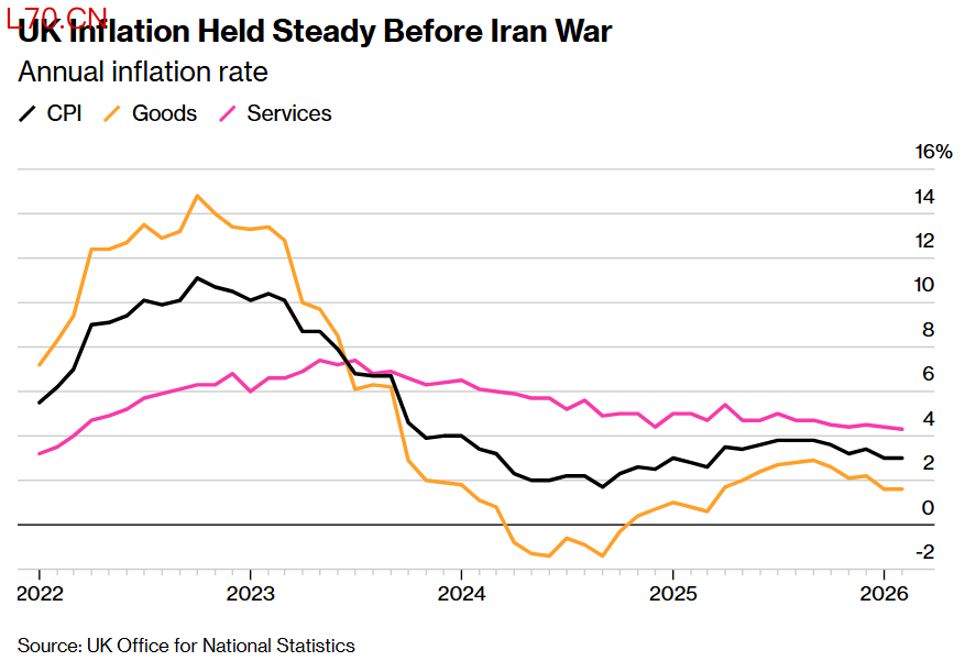 在新一轮中东地缘政治紧张局势导致全球汽油成本飙升,并威胁给家庭财务带来又一轮剧烈冲击之前,英国通胀维持在 11个月以来的最低点。英国国家统计局周三表示,2月消费者价格指数(即整体CPI)涨幅维持在3%。这一读数符合经济学家们对持平结果的预期。然而随着中东新一轮冲突大幅推高了国际油价,预计将加剧英国2026年通货膨胀态势。